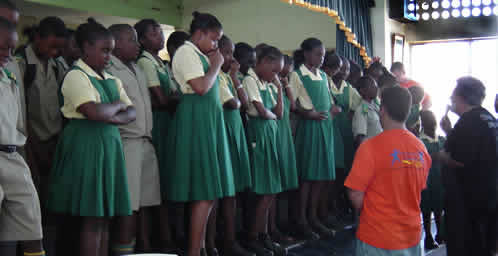 In this school, so many came forward that the overflow was pushed up onto the stage. God moved in a special way as the kids stood in front of their friends to confess Jesus Christ. Surrounded by students we lead the kids on the stage in the sinner's prayer. |