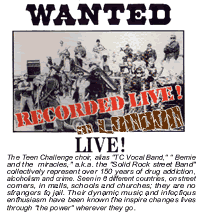 The Teen Challenge Choir, alias "TC Vocal Band," Bernie and the miracles," a.k.a. the "Solid Rock street Band" collectively represent over 150 years of drug addiction, alcoholism and crime. Seen in 6 different countries, on street corners, in malls, schools and churches; they are no strangers to jail. Their dynamic music and infectious enthusiasm have been known the inspire changes lives through "the power" wherever they go.
