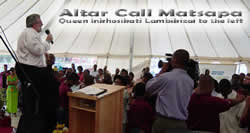 We had a huge altar response, and it really kept us busy with ministry for about 20 minutes. Then the liaison from the Prime Minister's office suddenly came and said that the Queen wanted to come forward for me pray for her. The tent had to be cleared before she could come. As soon as they had cleared the tent, we had opportunity to pray with the Inkhosikati Lambikizai. She said, "I want to be filled with the Holy Spirit and speak in tongues." |